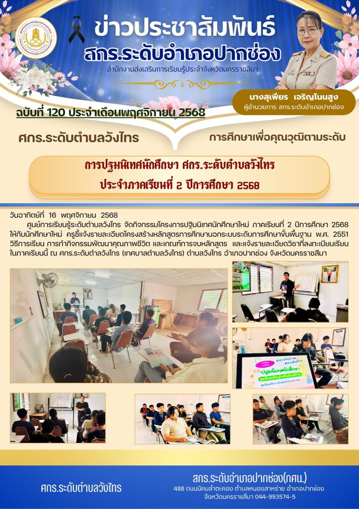 ศูนย์การเรียนรู้ระดับตำบลวังไทร จัดกิจกรรมโครงการปฐิมนิเทศนักศึกษาใหม่ ภาคเรียนที่ 2 ปีการศึกษา 2568 ให้กับนักศึกษาใหม่ ครูชี้แจ้งรายละเอียดโครงสร้างหลักสูตรการศึกษานอกระบบระดับการศึกษาขั้นพื้นฐาน พ.ศ. 2551 วิธีการเรียน การทำกิจกรรมพัฒนาคุณภาพชีวิต และเกณฑ์การจบหลักสูตร และแจ้งรายละเอียดวิชาที่ลงทะเบียนเรียนในภาคเรียนนี้ ณ ศกร.ระดับตำลวังไทร (เทศบาลตำบลวังไทร) ตำบลวังไทร อำเภอปากช่อง จังหวัดนครราชสีมา