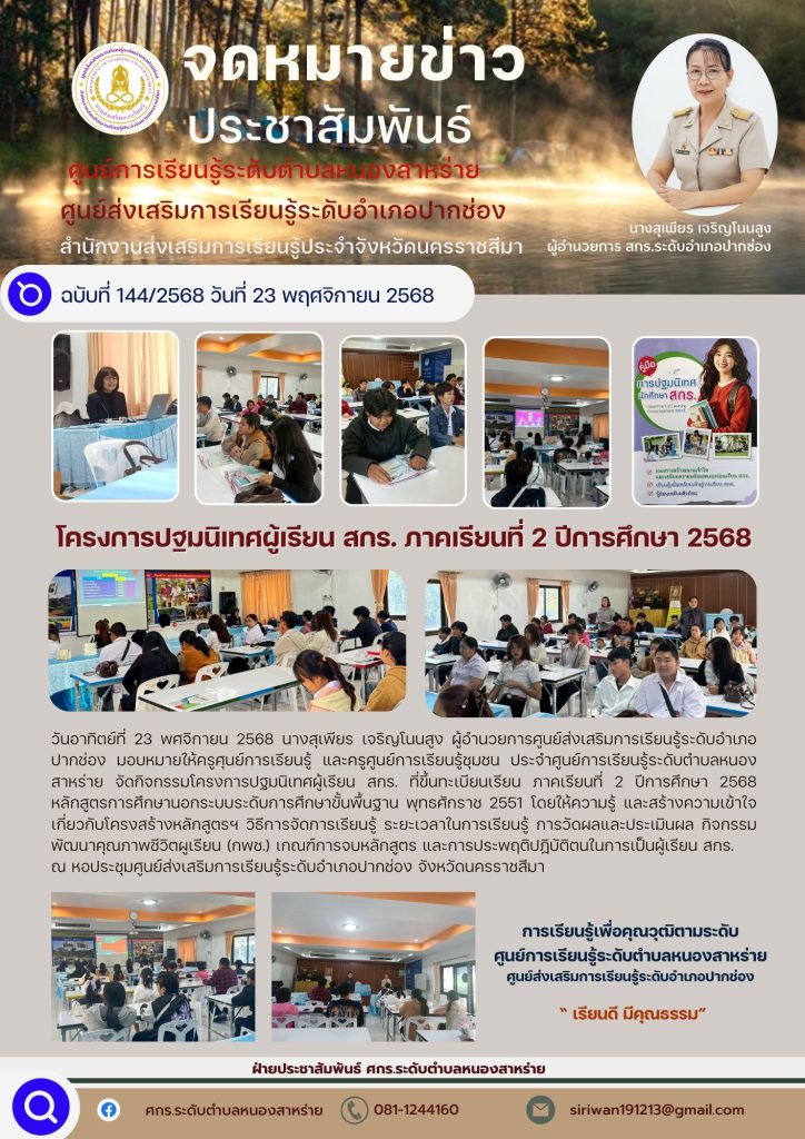 วันอาทิตย์ที่ 23 พฤศจิกายน 2568 นางสุเพียร เจริญโนนสูง ผู้อำนวยการศูนย์ส่งเสริมการเรียนรู้ระดับอำเภอปากช่อง มอบหมายให้ คณะครูศูนย์การเรียนรู้และครูศูนย์การเรียนชุมชน ประจำศูนย์การเรียนรู้ระดับตำบลหนองสาหร่าย จัดกิจกรรมโครงการปฐมนิเทศผู้เรียนสกร.ที่ขึ้นทะเบียนเรียนภาคเรียนที่ 2 ปีการศึกษา 2568 หลักสูตรการศึกษานอกระบบระดับการศึกษาขั้นพื้นฐานพุทธศักราช 2551 โดยคณะครูศูนย์การเรียนรู้ได้ให้ความรู้และสร้างความเข้าใจเกี่ยวกับโครงสร้างหลักสูตร วิธีการจัดการเรียนรู้ ระยะเวลาในการเรียนรู้ การวัดผลและประเมินผล กิจกรรมพัฒนาคุณภาพชีวิตผู้เรียน เกณฑ์การจบหลักสูตรและการประพฤติปฏิบัติตนในการเป็นผู้เรียน สกร.ณ หอประชุมศูนย์ส่งเสริมการเรียนรู้ระดับอำเภอปากช่องจังหวัดนครราชสีมา