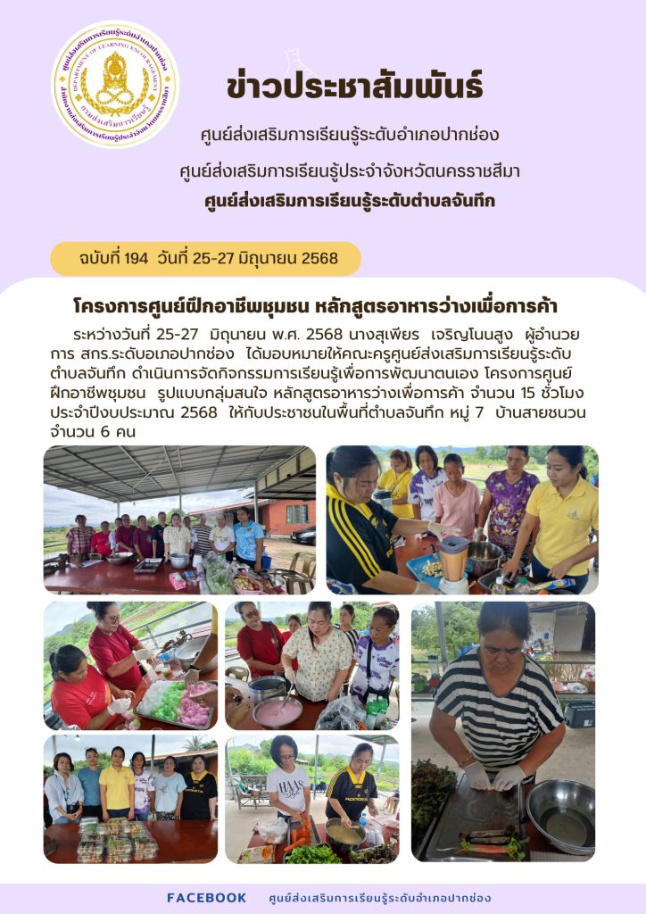 นางสุเพียร เจริญโนนสูง ผู้อำนวยการ สกร.ระดับอำเภอปากช่อง ได้มอบหมายให้คณะครูศูนย์ส่งเสริมการเรียนรู้ระดับตำบลจันทึก ดำเนินการจัดกิจกรรมการเรียนรู้เพื่อการพัฒนาตนเอง โครงการศูนย์ฝึกอาชีพชุมชน รูปแบบกลุ่มสนใจ หลักสูตรอาหารว่างเพื่อการค้า จำนวน 15 ชั่วโมง ประจำปีงบประมาณ 2568 ให้กับประชาชนในพื้นที่ตำบลจันทึก หมู่ 7 บ้านสายชนวน จำนวน 6 คน