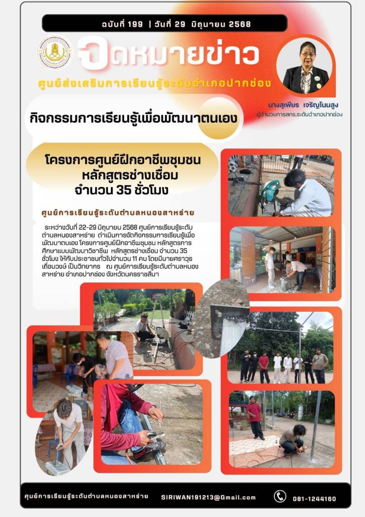 ศกร.ระดับตำบลหนองสาหร่ายดำเนินการจัดกิจกรรมการเรียนรู้เพื่อการพัฒนาตนเอง โครงการศูนย์ฝึกอาชีพชุมชน หลักสูตรช่างเชื่อม จำนวน 35ชั่วโมง จำนวนผู้เรียน 11 คน ณ ศูนย์การเรียนรู้ระดับตำบลหนองสาหร่าย อำเภอปากช่อง จังหวัดนครราชสีมา