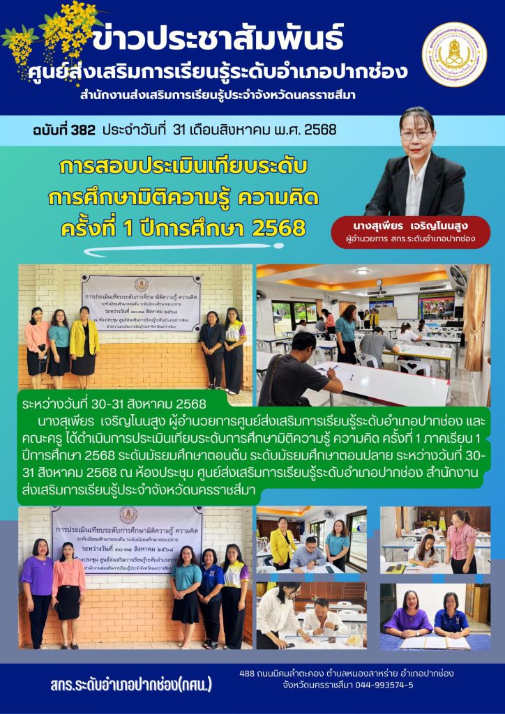 นางสุเพียร เจริญโนนสูง ผู้อำนวยการศูนย์ส่งเสริมการเรียนรู้ระดับอำเภอปากช่อง และคณะครู ได้ดำเนินการประเมินเทียบระดับการศึกษามิติความรู้ ความคิด ครั้งที่ 1 ภาคเรียน 1 ปีการศึกษา 2568 ระดับมัธยมศึกษาตอนต้น ระดับมัธยมศึกษาตอนปลาย ระหว่างวันที่ 30-31 สิงหาคม 2568 ณ ห้องประชุม ศูนย์ส่งเสริมการเรียนรู้ระดับอำเภอปากช่อง สำนักงานส่งเสริมการเรียนรู้ประจำจังหวัดนครราชสีมา