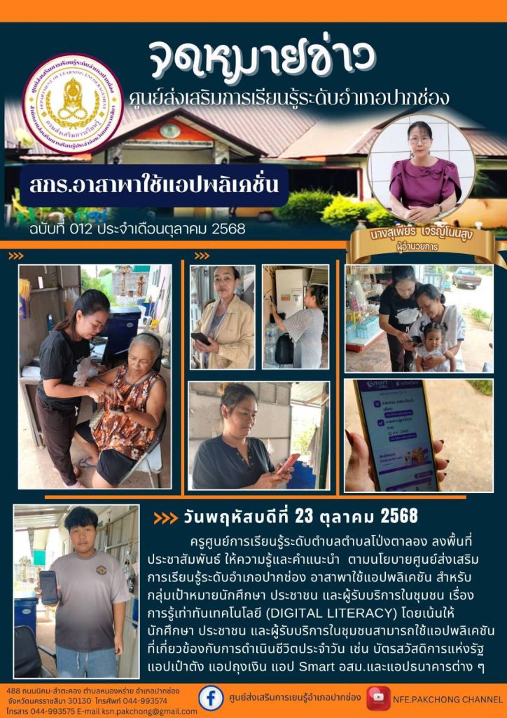 ครูศูนย์การเรียนรู้ระดับตำบลตำบลโป่งตาลอง ลงพื้นที่ประชาสัมพันธ์ ให้ความรู้และคำแนะนำ ตามนโยบายศูนย์ส่งเสริมการเรียนรู้ระดับอำเภอปากช่อง อาสาพาใช้แอปพลิเคชัน สำหรับกลุ่มเป้าหมายนักศึกษา ประชาชน และผู้รับบริการในชุมชน เรื่องการรู้เท่าทันเทคโนโลยี (DIGITAL LITERACY) โดยเน้นให้นักศึกษา ประชาชน และผู้รับบริการในชุมชนสามารถใช้แอปพลิเคชันที่เกี่ยวข้องกับการดำเนินชีวิตประจำวัน เช่น บัตรสวัสดิการแห่งรัฐ แอปเป๋าตัง แอปถุงเงิน แอป Smart อสม.และแอปธนาคารต่าง ๆ