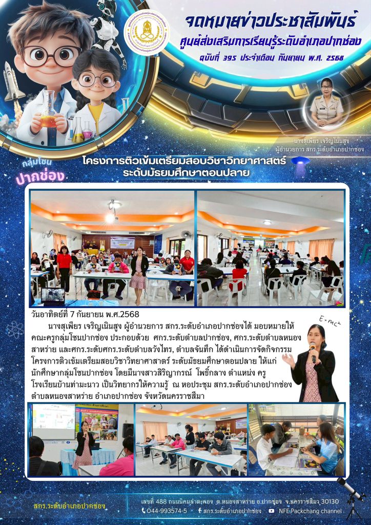 คณะครูศูนย์การเรียนรู้กลุ่มโซนปากช่อง ประกอบด้วย ศกร.ระดับตำบลปากช่อง, ศกร.ระดับตำบลหนองสาหร่าย และศกร.ระดับศกร.ระดับตำบลวังไทร, ตำบลจันทึก ได้ดำเนินการจัดกิจกรรมโครงการติวเข้มเตรียมสอบวิชาวิทยาศาสาตร์ ระดับมัธยมศึกษาตอนปลาย ให้แก่ นักศึกษากลุ่มโซนปากช่อง โดยมีนางสาวสิริญากรณ์ โพธิ์กลาง ตำแหน่ง ครู จากโรงเรียนบ้านท่ามะนาว เป็นวิทยากรให้ความรู้ ณ หอประชุม สกร.ระดับอำเภอปากช่อง ตำบลหนองสาหร่าย อำเภอปากช่อง จังหวัดนครราชสีมา