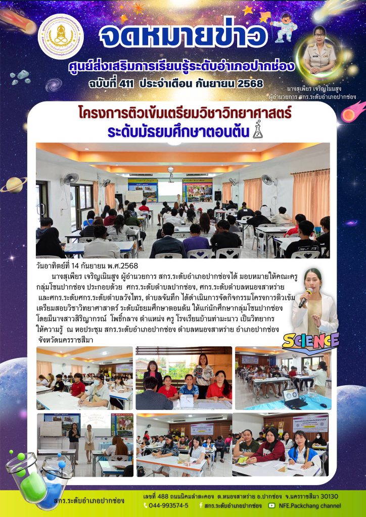 คณะครูศูนย์การเรียนรู้กลุ่มโซนปากช่อง ประกอบด้วย ศกร.ระดับตำบลปากช่อง, ศกร.ระดับตำบลหนองสาหร่าย และศกร.ระดับศกร.ระดับตำบลวังไทร, ตำบลจันทึก ได้ดำเนินการจัดกิจกรรมโครงการติวเข้มเตรียมสอบวิชาวิทยาศาสาตร์ ระดับมัธยมศึกษาตอนต้น ให้แก่ นักศึกษากลุ่มโซนปากช่อง โดยมีนางสาวสิริญากรณ์ โพธิ์กลาง ตำแหน่ง ครู จากโรงเรียนบ้านท่ามะนาว เป็นวิทยากรให้ความรู้ ณ หอประชุม สกร.ระดับอำเภอปากช่อง ตำบลหนองสาหร่าย อำเภอปากช่อง จังหวัดนครราชสีมา