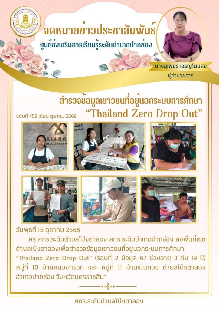 ครู ศกร.ระดับตำบลโป่งตาลอง สกร.ระดับอำเภอปากช่อง ลงพื้นที่เขตตำบลโป่งตาลองเพื่อสำรวจข้อมูลเยาวชนที่อยู่นอกระบบ การศึกษา Thailand Zero Drop Out (รอบที่ 2 ข้อมูล 67 ช่วงอายุ 3 ถึง 19 ปี) ณ หมู่ที่ 10 บ้านหนองกรวด และ หมู่ที่ 11 บ้านเนินทอง ตำบลโป่งตาลอง อำเภอปากช่อง จังหวัดนครราชสีมา