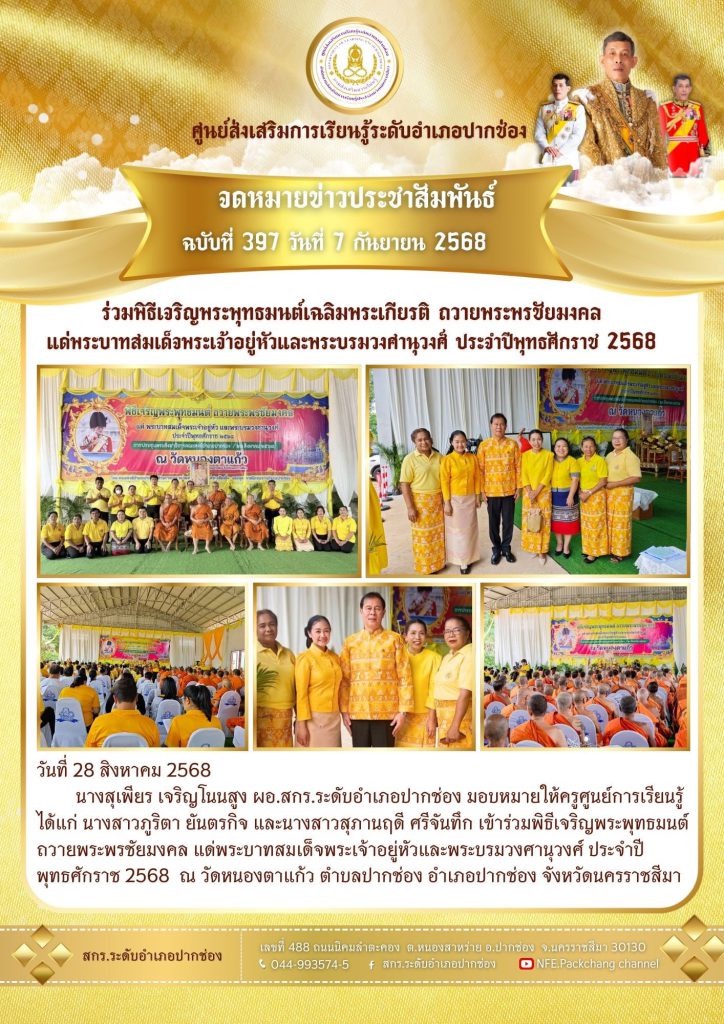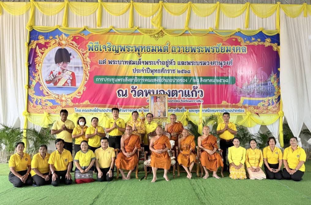 นางสาวภูริตา ยันตรกิจ และนางสาวสุภานฤดี ศรีจันทึก ได้เข้าร่วมพิธีเจริญพระพุทธมนต์ ถวายพระพรชัยมงคล แด่พระบาทสมเด็จพระเจ้าอยู่หัว และพระบรมวงศานุวงศ์ ประจำปีพุทธศักราช 2568 ณ วัดหนองตาแก้ว ตำบลปากช่อง อำเภอปากช่อง จังหวัดนครราชสีมา