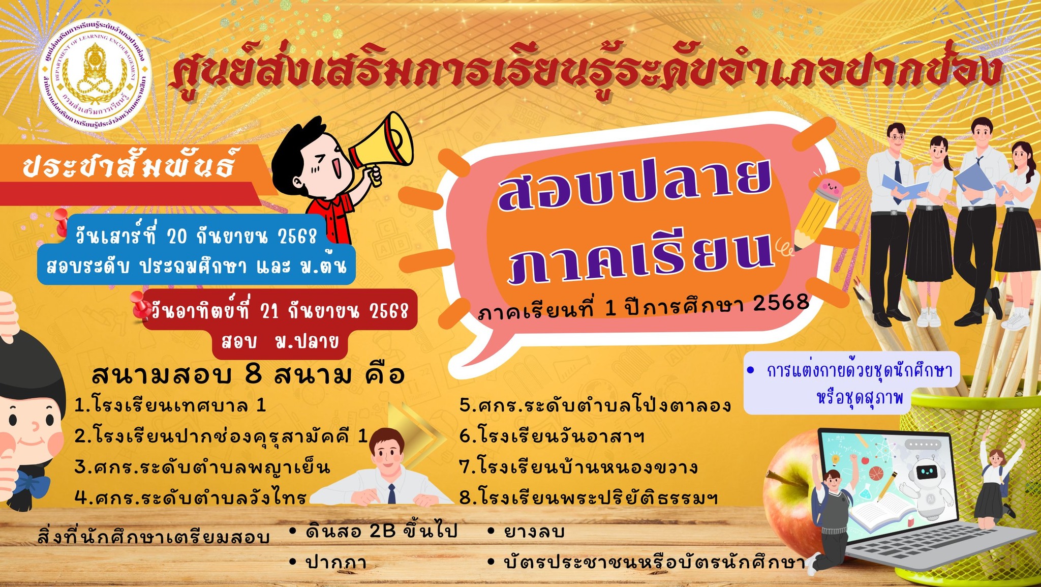 แจ้งสอบปลายภาคเรียน 1 ปีการศึกษา 2568 วันเสาร์ที่ 20 กันยายน 2568 #ระดับประถมศึกษา / #ระดับมัธยมศึกษาตอนต้น วันอาทิตย์ที่ 21 กันยายน 2568 #ระดับมัธยมศึกษาตอนปลาย