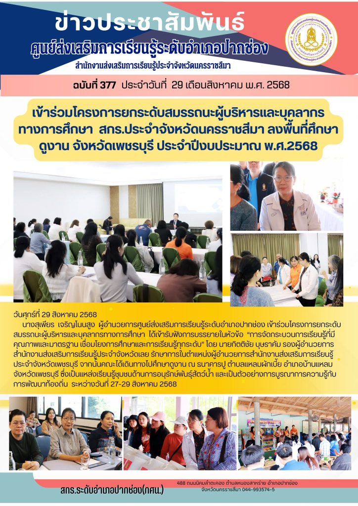 นางสุเพียร เจริญโนนสูง ผู้อำนวยการศูนย์ส่งเสริมการเรียนรู้ระดับอำเภอปากช่อง เข้าร่วมโครงการยกระดับสมรรถนะผู้บริหารและบุคลากรทางการศึกษา ได้เข้ารับฟังการบรรยายในหัวข้อ “การจัดกระบวนการเรียนรู้ที่มีคุณภาพและมาตรฐาน เชื่อมโยงการศึกษาและการเรียนรู้ทุกระดับ” โดย นายกิตติชัย บุษราคัม รองผู้อำนวยการสำนักงานส่งเสริมการเรียนรู้ประจำจังหวัดเลย รักษาการในตำแหน่งผู้อำนวยการสำนักงานส่งเสริมการเรียนรู้ประจำจังหวัดเพชรบุรี​ จากนั้นคณะได้เดินทางไปศึกษาดูงาน ณ ธนาคารปู ตำบลแหลมผักเบี้ย อำเภอบ้านแหลม จังหวัดเพชรบุรี​ ซึ่งเป็นแหล่งเรียนรู้ชุมชนด้านการอนุรักษ์พันธุ์สัตว์น้ำ และเป็นตัวอย่างการบูรณาการความรู้กับการพัฒนาท้องถิ่น ระหว่างวันที่ 27-29 สิงหาคม​ 2568
