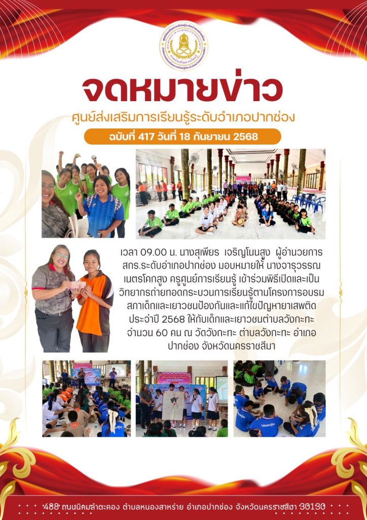 นางสุเพียร เจริญโนนสูง ผู้อำนวยการ สกร.ระดับอำเภอปากช่อง มอบหมายให้ นางจารุวรรณ เนตรโคกสูง ครูศูนย์การเรียนรู้ เข้าร่วมพิธีเปิดและเป็นวิทยากรถ่ายทอดกระบวนการเรียนรู้ตามโครงการอบรมสภาเด็กและเยาวชนป้องกันและแก้ไขปัญหายาเสพติด ประจำปี 2568 ให้กับเด็กและเยาวชนตำบลวังกะทะ จำนวน 60 คน ณ วัดวังกะทะ ตำบลวังกะทะ อำเภอปากช่อง จังหวัดนครราชสีมา