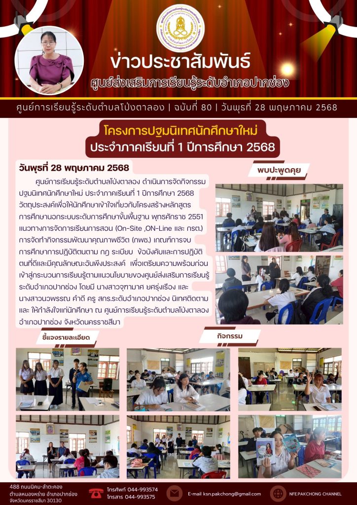ศูนย์การเรียนรู้ระดับตำบลโป่งตาลอง ดำเนินการจัดกิจกรรมปฐมนิเทศนักศึกษาใหม่ ประจำภาคเรียนที่ 1 ปีการศึกษา 2568 วัตถุประสงค์เพื่อให้นักศึกษาเข้าใจเกี่ยวกับโครงสร้างหลักสูตรการศึกษานอกระบบระดับการศึกษาขั้นพื้นฐาน พุทธศักราช 2551 แนวทางการจัดการเรียนการสอน (On-Site ,ON-Line และ กรต.) การจัดทำกิจกรรมพัฒนาคุณภาพชีวิต (กพช.) เกณฑ์การจบการศึกษาการปฏิบัติตนตาม กฎ ระเบียบ ข้อบังคับและการปฏิบัติตนที่ดีและมีคุณลักษณะอันพึงประสงค์ เพื่อเตรียมความพร้อมก่อนเข้าสู่กระบวนการเรียนรู้ตามแนวนโยบายของศูนย์ส่งเสริมการเรียนรู้ระดับอำเภอปากช่อง โดยมี นางสาวจุฑามาศ ยศรุ่งเรือง และ นางสาวนวพรรณ คำดี ตำแหน่ง ครู สกร.ระดับอำเภอปากช่อง นิเทศติดตาม และ ให้กำลังใจแก่นักศึกษา ณ ศูนย์การเรียนรู้ระดับตำบลโป่งตาลอง อำเภอปากช่อง จังหวัดนครราชสีมา