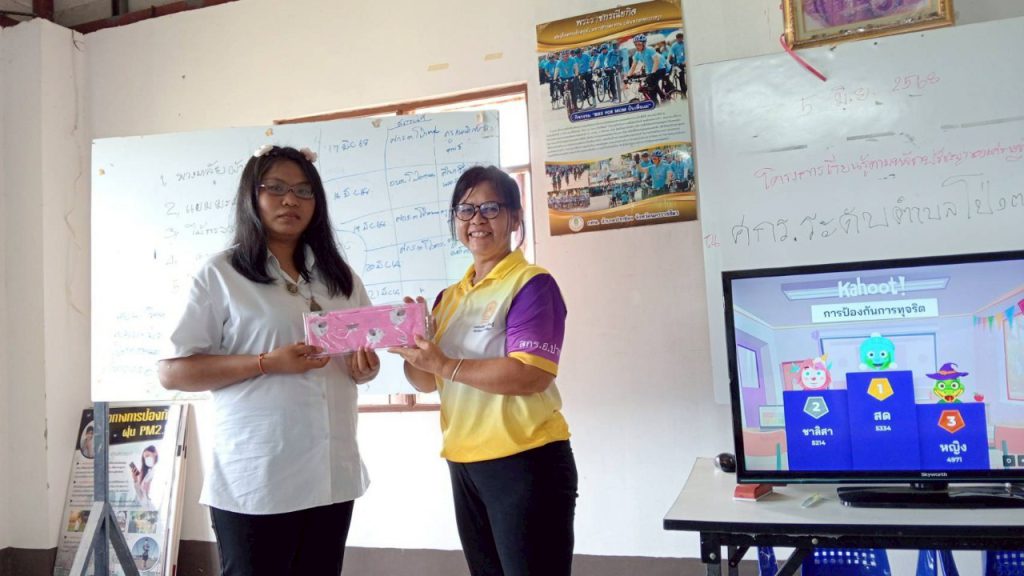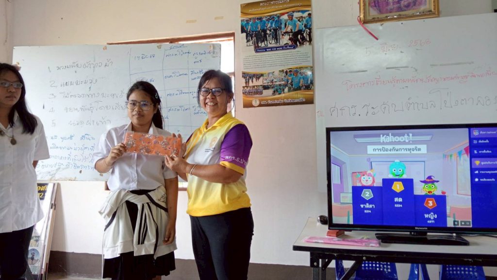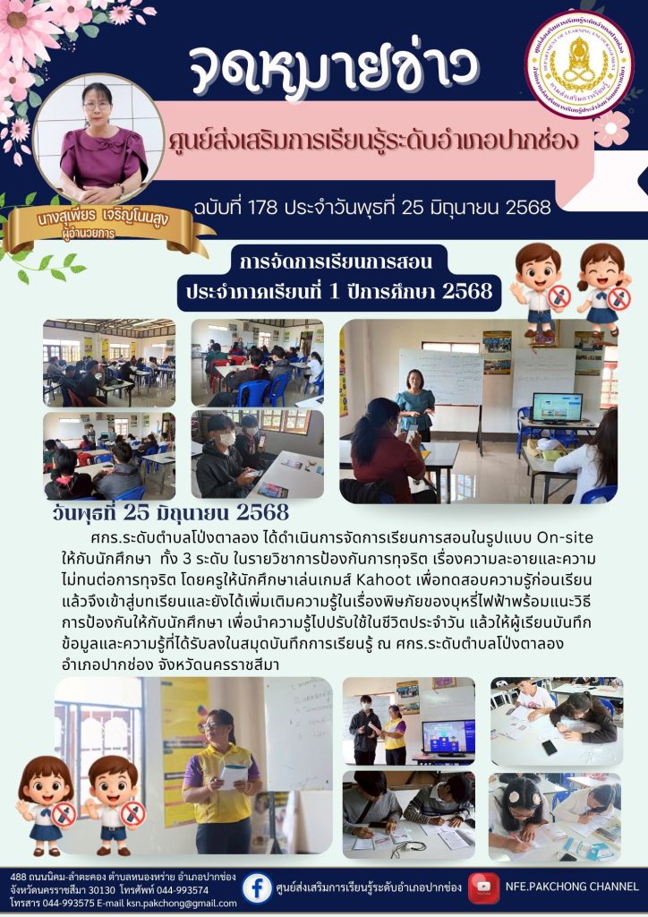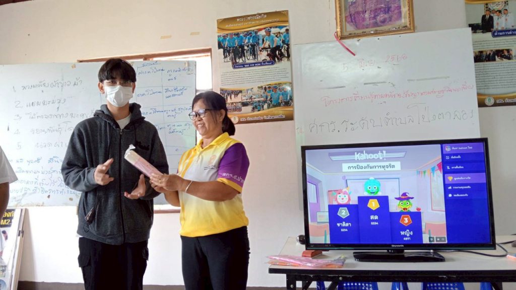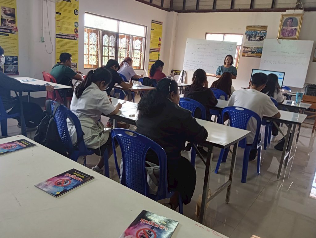 ศกร.ระดับตำบลโป่งตาลอง ได้ดำเนินการจัดการเรียนการสอนในรูปแบบ On-site ให้กับนักศึกษา ทั้ง 3 ระดับ ในรายวิชาการป้องกันการทุจริต เรื่องความละอายและความไม่ทนต่อการทุจริต โดยครูให้นักศึกษาเล่นเกมส์ Kahoot เพื่อทดสอบความรูัก่อนเรียนแล้วจึงเข้าสู่บทเรียนและยังได้เพิ่มเติมความรู้ในเรื่องพิษภัยของบุหรี่ไฟฟ้าพร้อมแนะวิธีการป้องกันให้กับนักศึกษา เพื่อนำความรู้ไปปรับใช้ในชีวิตประจำวัน แล้วให้ผู้เรียนบันทึกข้อมูลและความรู้ที่ได้รับลงในสมุดบันทึกการเรียนรู้ ณ ศกร.ระดับตำบลโป่งตาลอง อำเภอปากช่อง จังหวัดนครราชสีมา