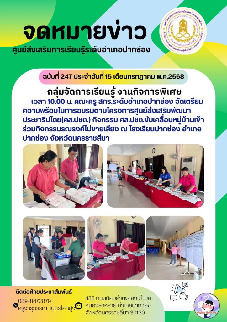 คณะครู สกร.ระดับอำเภอปากช่อง จัดเตรียมความพร้อมในการอบรมตามโครงการศูนย์ส่งเสริมพัฒนาประชาธิปไตย(ศส.ปชต.) กิจกรรม ศส.ปชต. ขับเคลื่อนหมู่บ้านเข้าร่วมกิจกรรมรณรงค์ไม่ขายเสียง ณ โรงเรียนปากช่อง อำเภอปากช่อง จังหวัดนครราชสีมา