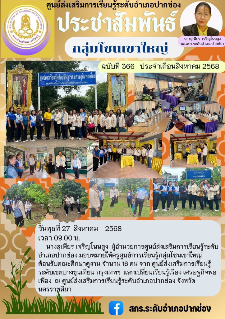 เวลา 09.00 น. นางสุเพียร เจริญโนนสูง ผู้อำนวยการศูนย์ส่งเสริมการเรียนรู้ระดับอำเภอปากช่อง มอบหมายให้ครูศูนย์การเรียนรู้กลุ่มโซนเขาใหญ่ต้อนรับคณะศึกษาดูงาน จำนวน 16 คน จาก ศูนย์ส่งเสริมการเรียนรู้ระดับเขตบางขุนเทียน กรุงเทพฯ แลกเปลี่ยนเรียนรู้เรื่อง เศรษฐกิจพอเพียง ณ ศูนย์ส่งเสริมการเรียนรู้ระดับอำเภอปากช่อง จังหวัดนครราชสีมา