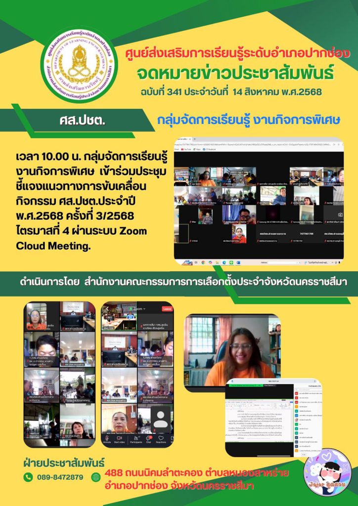 กลุ่มจัดการเรียนรู้ งานกิจการพิเศษ เข้าร่วมประชุมชี้แจงแนวทางการขับเคลื่อนกิจกรรม ศส.ปชต.ประจำปี พ.ศ.2568 ครั้งที่ 3/2568 ไตรมาสที่ 4 ผ่านระบบ Zoom Cloud Meeting ดำเนินการโดย สำนักงานคณะกรรมการการเลือกตั้งประจำจังหวัดนครราชสีมา