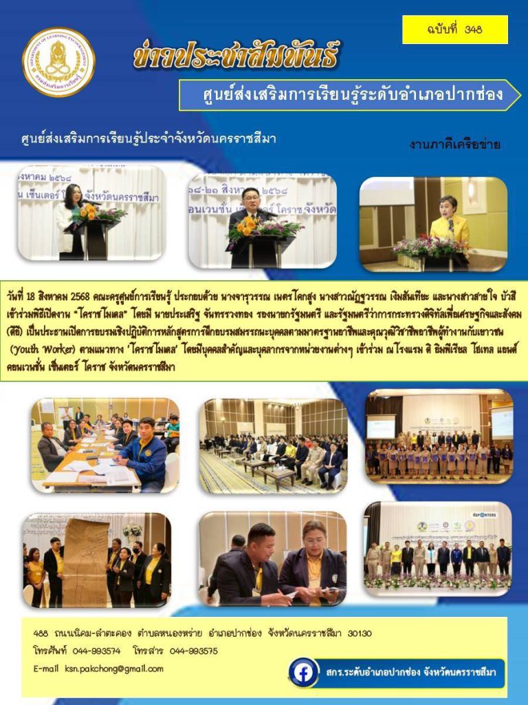 นางสาวณัฏฐวรรณ เงิมสันเทียะ ครูศูนย์การเรียนรู้ระดับตำบลโป่งตาลอง เข้าร่วมพิธีเปิดงาน “โคราชโมเดล” โดยมี นายประเสริฐ จันทรรวงทอง รองนายกรัฐมนตรี และรัฐมนตรีว่าการกระทรวงดิจิทัลเพื่อเศรษฐกิจและสังคม (ดีอี) เป็นประธานเปิดการอบรมเชิงปฏิบัติการหลักสูตรการฝึกอบรมสมรรถนะบุคคลตามมาตรฐานอาชีพและคุณวุฒิวิชาชีพอาชีพผู้ทํางานกับเยาวชน (Youth Worker) ตามแนวทาง ‘โคราชโมเดล’ โดยมีบุคคลสำคัญและบุคคลากรจากหน่วยงานต่างๆ เข้าร่วมที่โรงแรม ดิ อิมพีเรียล โฮเทล แอนด์ คอนเวนชั่น เซ็นเตอร์ โคราช จังหวัดนครราชสีมา