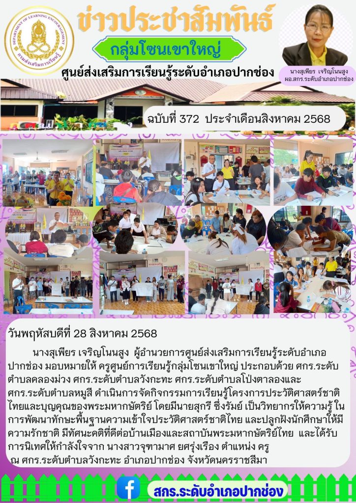 ครูศูนย์การเรียนรู้ระดับตำบลโป่งตาลองนำนักศึกษาเข้าร่วมโครงการประวัติศาสตร์ชาติไทยและบุญคุณของพระมหากษัตริย์ โดยมีนายสุกรี ซึ่งรัมย์ เป็นวิทยากรให้ความรู้ ในการพัฒนาทักษะพื้นฐานความเข้าใจประวัติศาสตร์ชาติไทย และปลูกฝังนักศึกษาให้มีความรักชาติ มีทัศนะคติที่ดีต่อบ้านเมืองและสถาบันพระมหากษัตริย์ไทย และได้รับการนิเทศให้กำลังใจจาก นางสาวจุฑามาศ ยศรุ่งเรือง ตำแหน่ง ครู ณ ศกร.ระดับตำบลวังกะทะ อำเภอปากช่อง จังหวัดนครราชสีมา