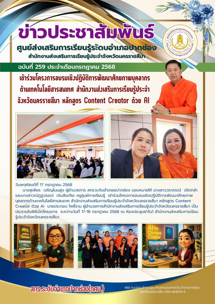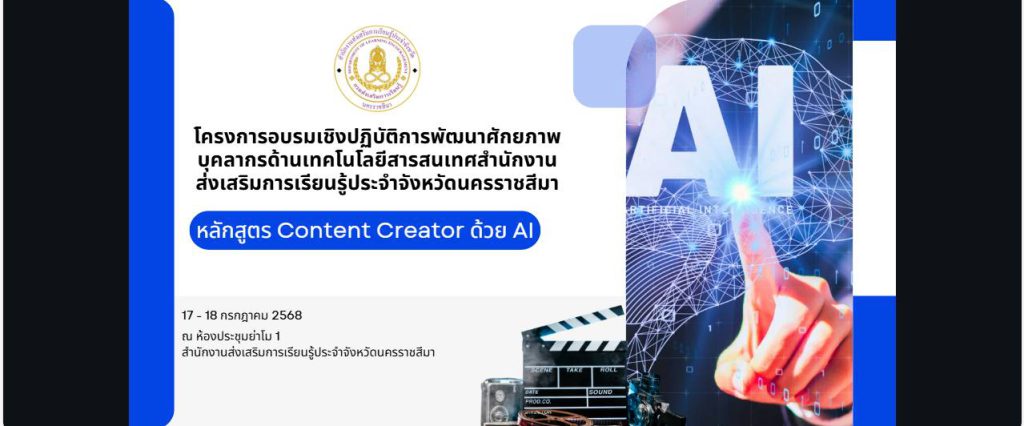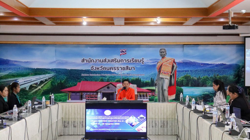 นางสาวณัฏฐวรรณ เงิมสันเทียะ ครูศูนย์การเรียนรู้ระดับตำบลโป่งตาลอง เข้าร่วมโครงการอบรมเชิงปฏิบัติการพัฒนาศักยภาพบุคลากรด้านเทคโนโลยีสารสนเทศ สำนักงานส่งเสริมการเรียนรู้ประจำจังหวัดนครราชสีมา หลักสูตร Content Creator ด้วย AI โดยมีนายประกอบ โพธิ์ราม ผู้อำนวยการสำนักงานส่งเสริมการเรียนรู้ประจำจังหวัดนครราชสีมา เป็นประธานในพิธีปิด พร้อมทั้งมอบเกียรติบัตรให้กับบุคลากรที่เข้าร่วมอบรม โดยมีวิทยากรของ สำนักงาน สกร.ประจำจังหวัดนครราชสีมา วัตถุประสงค์เพื่อเพิ่มศักยภาพของบุคลากร ด้านเทคโนโลยีดิจิทัล และเพิ่มศักยภาพในการใช้โปรแกรมต่างๆ ที่สนับสนุนการดำเนินงานของบุคลากรให้มีประสิทธิภาพมากยิ่งขึ้น ระหว่างวันที่ 17 – 18 กรกฎาคม 2568 ณ ห้องประชุมย่าโม 1 สำนักงานส่งเสริมการเรียนรู้ประจำจังหวัดนครราชสีมา อ.เมืองนครราชสีมา จ.นครราชสีมา